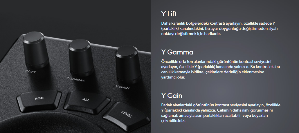 DaVinci Resolve kontrol panelleri, akıcılık ve aynı anda birden fazla parametre üzerinde tam kontrol sağlama amaçlı tasarlanmışlardır, böylece daha hızlı çalışabilme ve daha yaratıcı olabilme imkanına sahip oluyorsunuz. Donanım kontrolleri mantıklı bir şekilde elinizin doğal pozisyonlarının yakınına düzenlenmiştir ve en yüksek kalitedeki malzemelerden üretilmiştir. Tam doğruluğu olan ayarlamalar yapabilmeniz için pürüzsüz, yüksek çözünürlük ağırlıklı izotoplarına sahip oluyorsunuz. Tüm döner kontrol düğmeleri ve butonlar, gereken dayanıklılığın tam seviyesine göre özel tasarlanmıştır, böylelikle her türlü parametreye tam doğrulukla ince ayar yapabilirsiniz. En güzeli de, donanım panelleri, hepsi aynı anda olmak üzere, lift, gamma ve gain gibi birden çok ayarı düzenlemenize imkan sağlar, ve neticede bir mouse ile mümkün olabilecek seviyenin çok daha ötesinde bir yaratıcı kontrol sağlar.