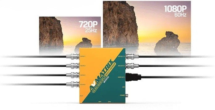 AVMatrix 3G-SDI Quad Split Multiviewer’ı çok işlevli bir cihazdır: SDI ve HDMI çıkışlı 3G-SDI tam ekran /2/3/4 bölünmüş çoklu görüntüleyici, 3G-SDI–HDMI sinyal dönüştürücü, SDI ve HDMI çıkışlara sahip iki SDI dağıtım yükselteci ve SDI & HDMI çıkışlı 4x1 3G-SDI anahtarlayıcı. SDI ve HDMI çıkış formatı, yukarı/aşağı ölçekleme ve kare hızı dönüştürme sağlayabilir. Tüm işlevler dahili DIP anahtarları, USB klavye ve LAN portu üzerinden bir PC kullanılarak kolayca ayarlanabilir.
