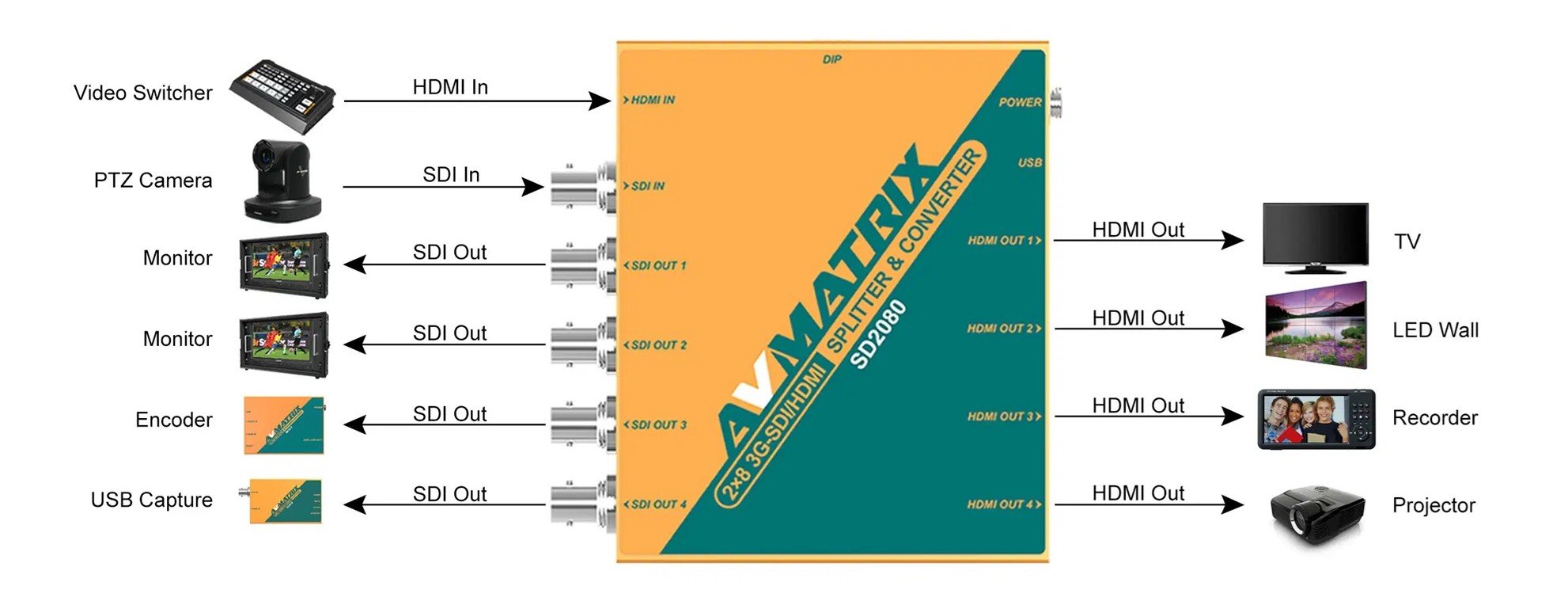- SDI ve HDMI arasında dağıtım ve dönüştürme