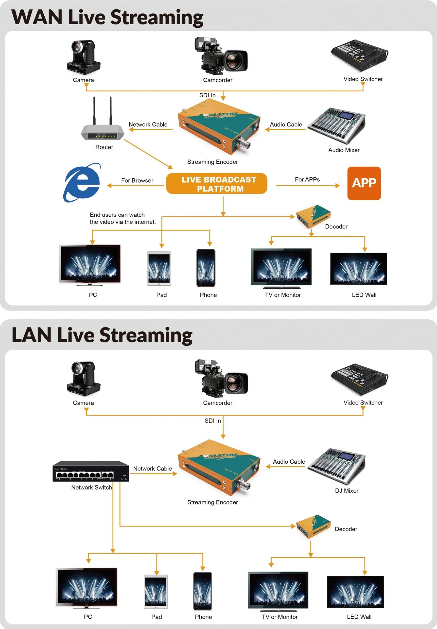 IP adresi üzerinden bir yayın sunucusuna çıkış yapmanıza olanak tanıyan AVMATRIX H.264/H.265 SDI Yayın Kodlayıcı, bir bilgisayara bağlanmadan verimli şekilde canlı yayın yapmanızı sağlar. SDI girişi ve döngü çıkışının yanı sıra bağımsız bir 3.5 mm ses girişi sunar. Bu sayede gömülü ses ile birlikte 1080p60’a kadar videoyu bir IP akışına kodlayabilir veya yalnızca sesi kodlamayı seçebilir ve her iki sinyali de Ethernet arayüzü üzerinden gönderirken giriş videosunu yerel olarak izleyebilirsiniz. Facebook, YouTube ve Wowza gibi popüler yayın platformlarına; düğün canlı yayınları, spor etkinlikleri, canlı tıbbi yayınlar ve eğitim faaliyetleri gibi uygulamalar için yayın yapabilirsiniz. Kodlayıcı, ana akış ve alt akış üzerinden çift akış (dual streaming) desteği sağlar. Ayrıca görüntü ve metin bindirme ile ayna/flip efektleri kaynağın üzerine uygulanabilir. Tüm seçenekler bir Web kullanıcı arayüzü üzerinden ayarlanabilir.