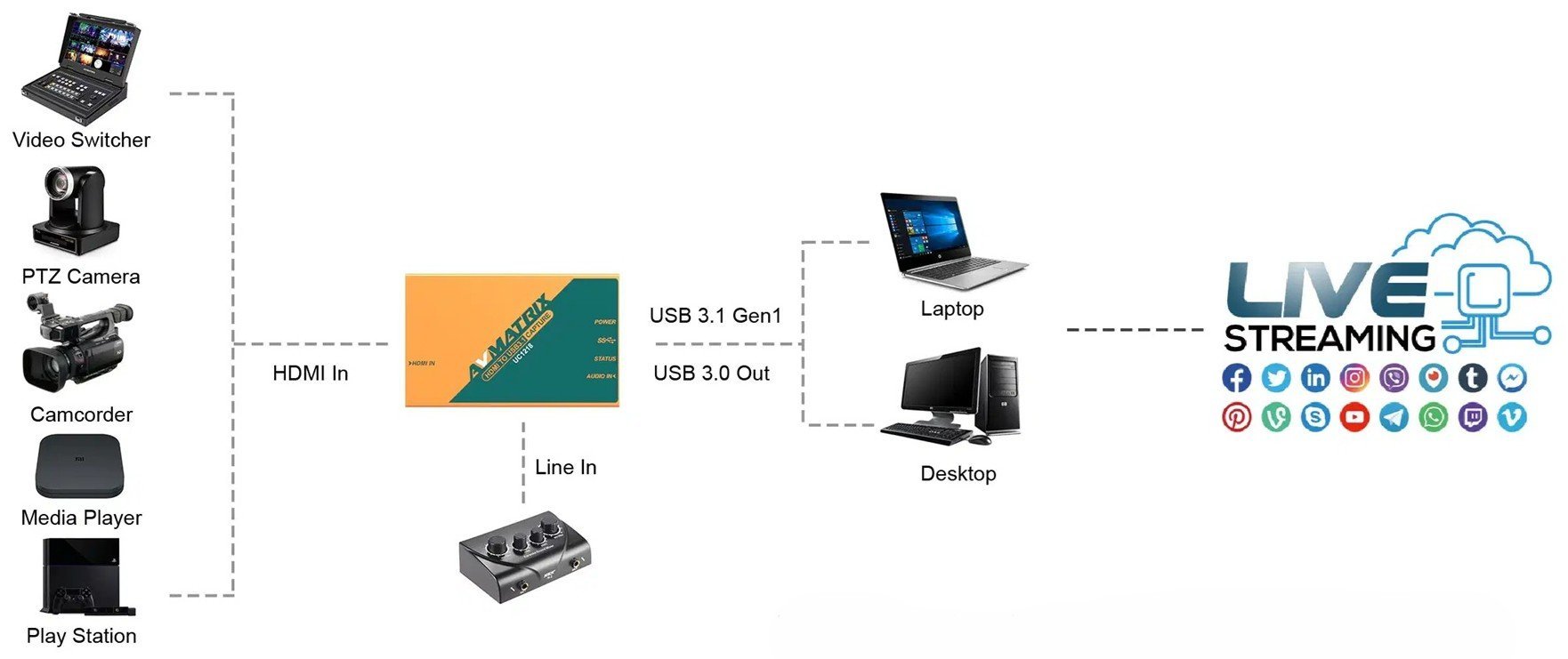 AVMATRIX UC1218 HDMI’den USB 3.1’a Video Yakalama Cihazı ile bir HDMI sinyalini USB 3.0 üzerinden kaydedebilir veya canlı yayınlayabilirsiniz. HDMI v1.4a girişi sayesinde cihaz, 1920 × 1080p60 çözünürlüğe kadar sinyalleri kabul eder. Gelen video formatını otomatik olarak algılar ve USB 3.0 üzerinden 350 MB/sn’ye kadar hızlarda iletir. UVC video yakalama ve YUV video çıkışı desteklenmektedir. Bu cihaz USB veri yolu (bus) üzerinden güç aldığından, aynı bilgisayara birden fazla ünite bağlamak mümkündür (ek USB donanımı gerekebilir). UC1218, Windows, Linux ve macOS için mevcut çeşitli üçüncü taraf yazılımlarla uyumludur.