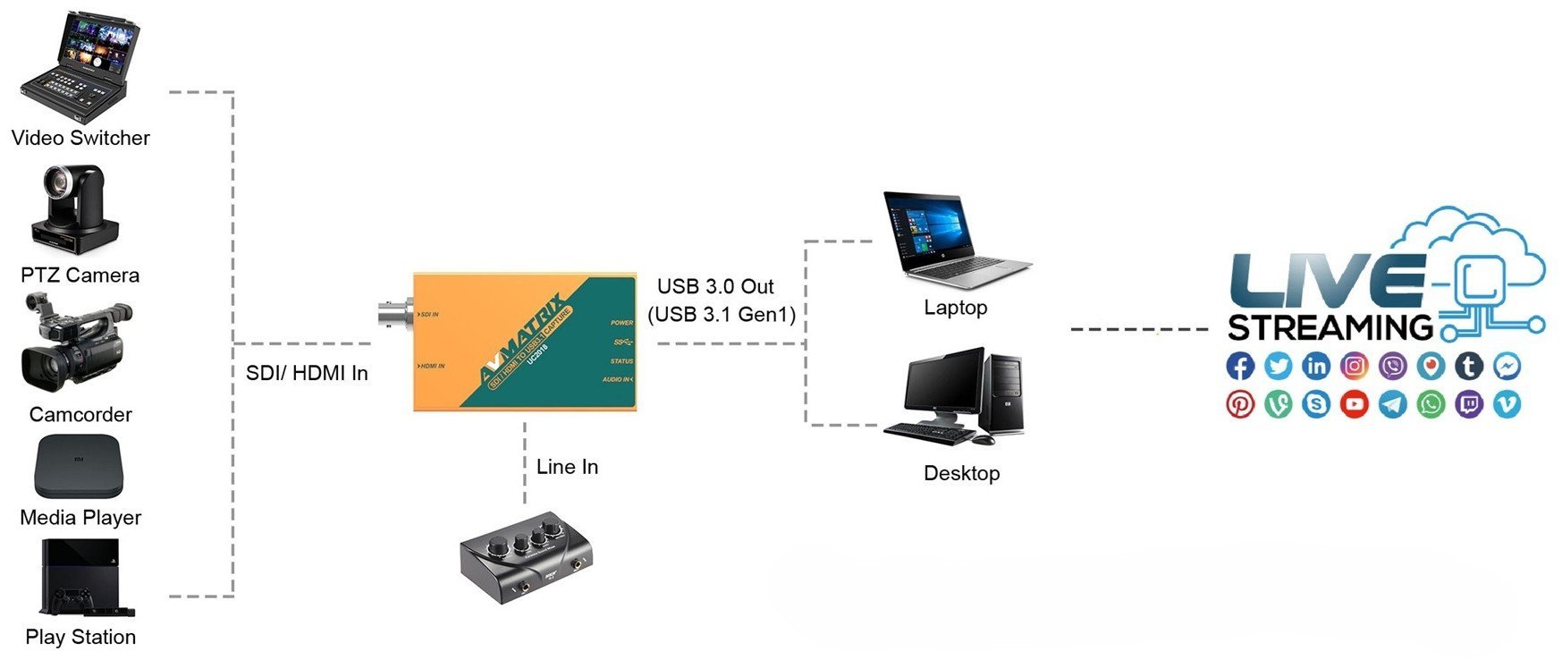AVMATRIX UC2018 HDMI/SDI’dan USB 3.1’e Video Yakalama Cihazı ile bir HDMI veya SDI sinyalini USB 3.0 üzerinden kaydedebilir veya canlı yayınlayabilirsiniz. 3G-SDI ve HDMI v1.4a girişleri sayesinde cihaz, 1920 × 1080p60 çözünürlüğe kadar sinyalleri kabul eder. Gelen video formatını otomatik olarak algılar ve USB 3.0 üzerinden 350 MB/sn’ye kadar hızlarda iletir. UVC video yakalama ve YUV video çıkışı desteklenmektedir.