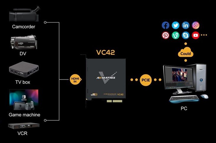 AVMATRIX’in VC42 1080p HDMI PCIE 4 Kanallı Capture Kartı ile oyunlarınızı veya içerik üretiminizi eş zamanlı olarak canlı yayınlayabilir ve kaydedebilirsiniz. Dört HDMI girişi sayesinde çoklu kaynakları aynı anda kullanabilirsiniz. PCIe 2.0x4 arayüzü, yüksek kaliteli görüntü için 1080p60 YUY2 sıkıştırılmamış videoyu destekler.